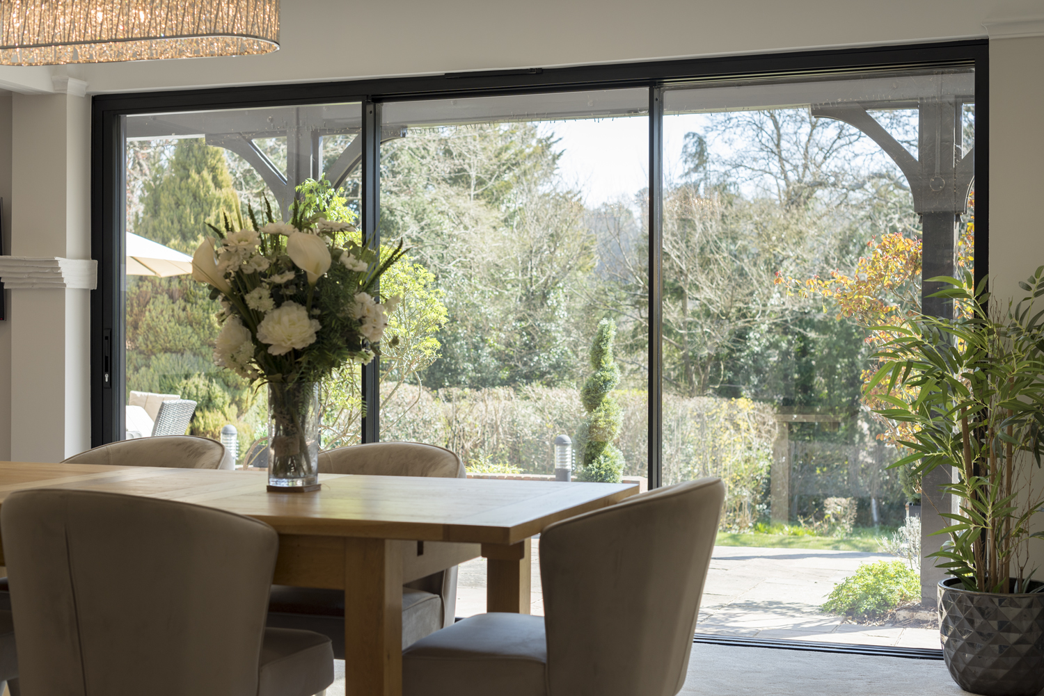 Technically engineered for strength and reliability, InfiniGLIDE3 supports large panels up to 2.5 m wide and 3 m high, maintaining smooth, effortless sliding even at maximum sizes. Its high-performance aluminium frame ensures durability, weather resistance, and long-term structural integrity, while keeping the overall profile slim and elegant.